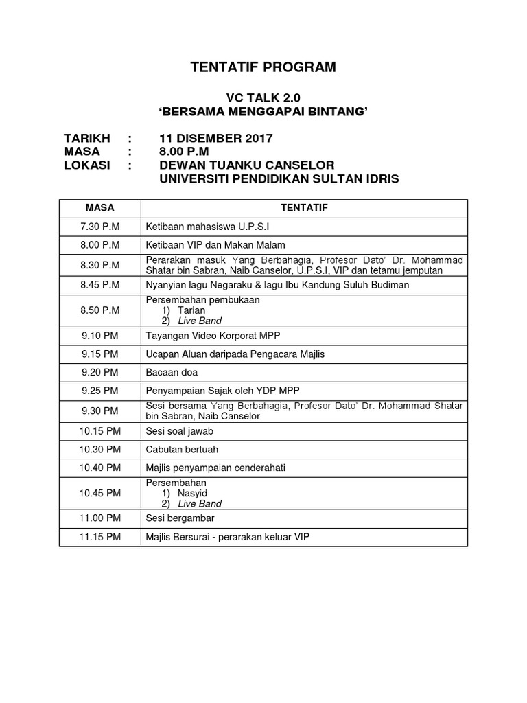 . TENTATIF MAJLIS MAKAN MALAM Formal 730 pm Pendaftaran 800 pm Ketibaan VVIP 815 pm Nyanyian lagu Negaraku dan Varsiti Kita - Bacaan Doa 825pm Ucapan Ketua Pengarah Program - Ucapan Pengerusi PPSKTM 840 pm Ucapan Perasmi Dekan 900 pm Jamuan 915 pm Tayangan Multimedia 925 pm Persembahan. Related Books Free with a. If you are author or own the copyright of this book please report to us by using this DMCA report form.